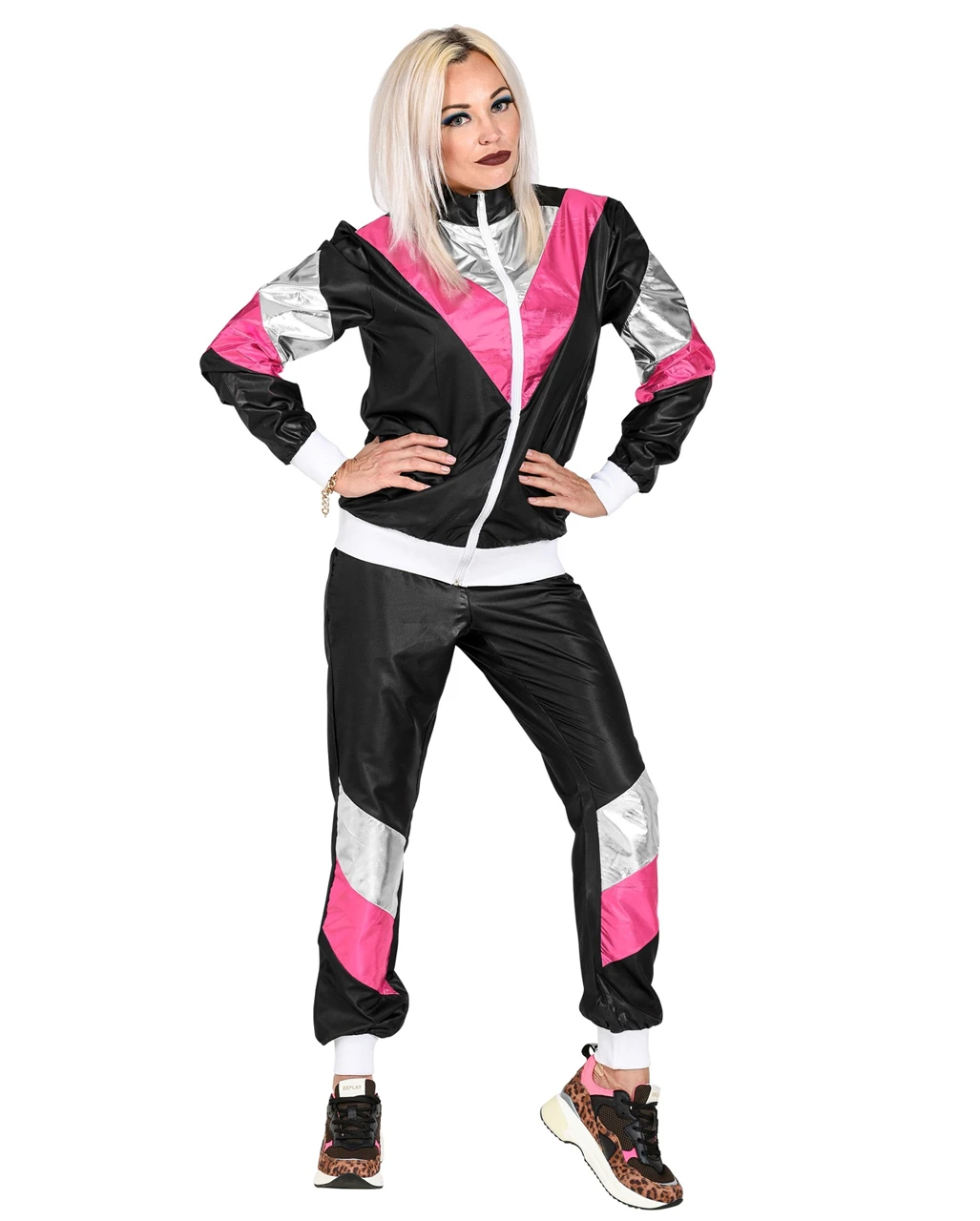 Der 80’s Retro Trainingsanzug ist Unisex und passt allen Geschlechtern. Mit der Farbgestaltung in Schwarz-Pink und Silber passt dieser perfekt in das Zeitalter von Disco, Schlager und fröhlicher Popmusik. Zweiteilig, bestehend aus Oberteil mit Reißverschluss und Hose mit Gummizug, lässt sich Trainingsanzug schnell und einfach an- und ausziehen. Jetzt noch ein paar Goldketten um den Hals, eine Spiegelbrille oder die damals beliebte „Schnelle Brille“ aufgesetzt, und fertig ist dein Mottoparty-Outfit!