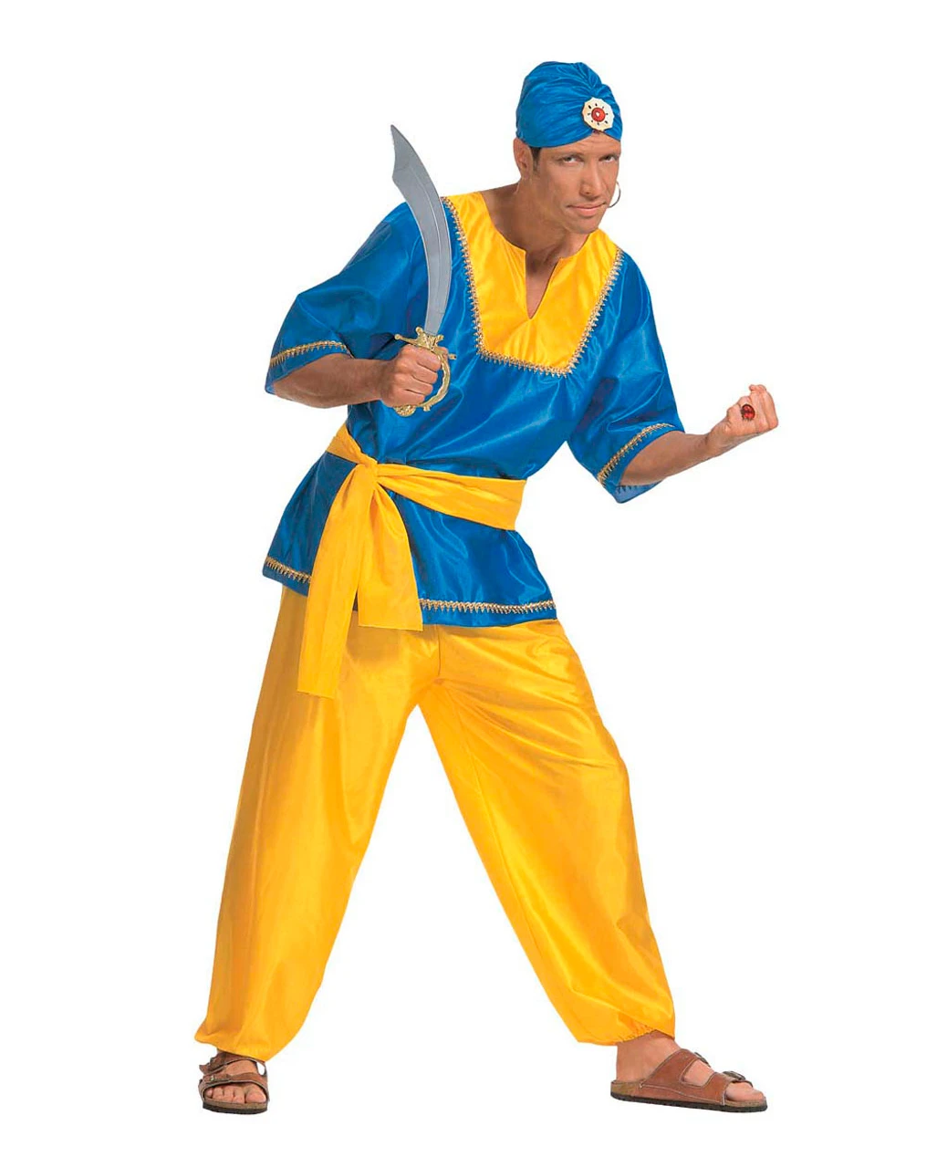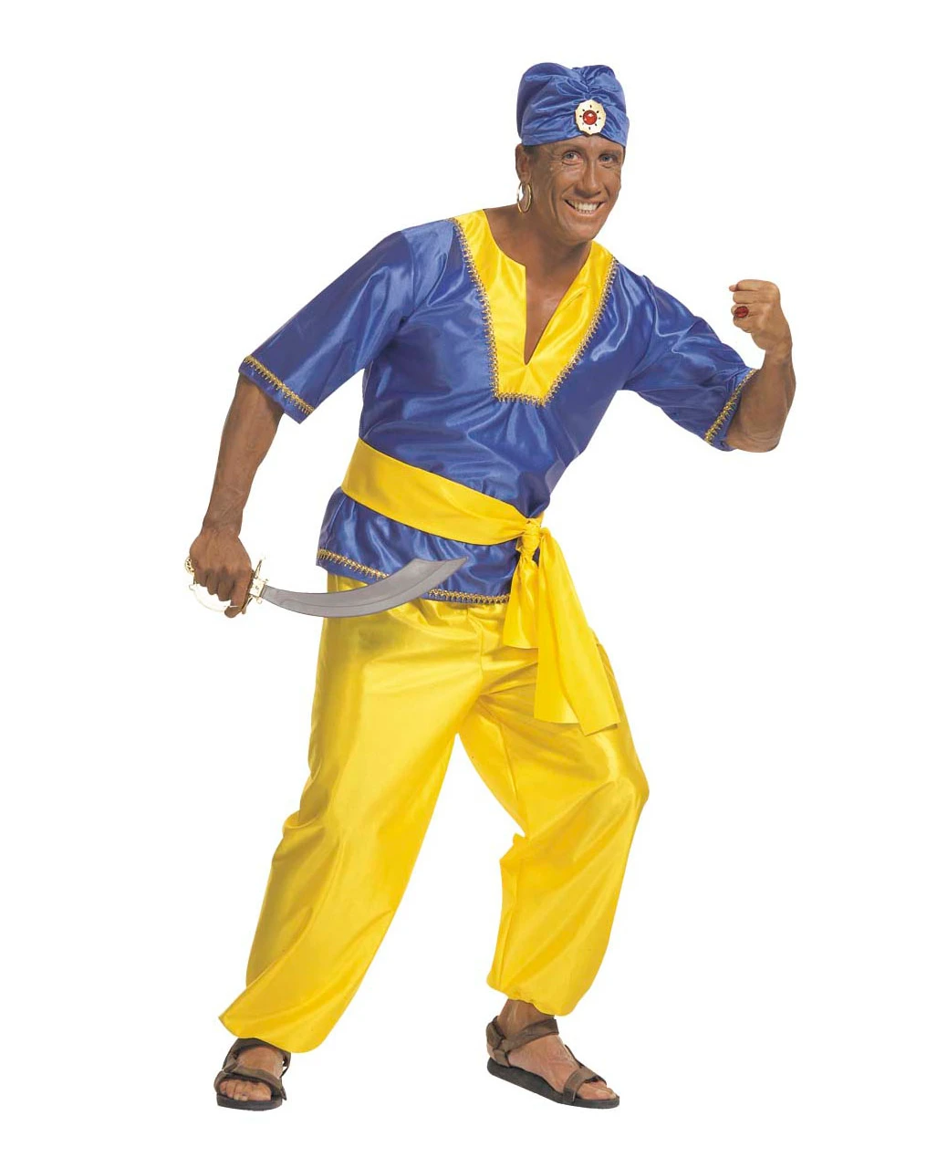 Das Arabischer Prinz Kostüm besteht aus: glänzender gelber Hose, blau/gelbem Oberteil mit orientalisch goldener Borte als Verzierung, einem gelbem Gürtel und blauem Turban auf dem ein roter Schmuckstein sitzt.