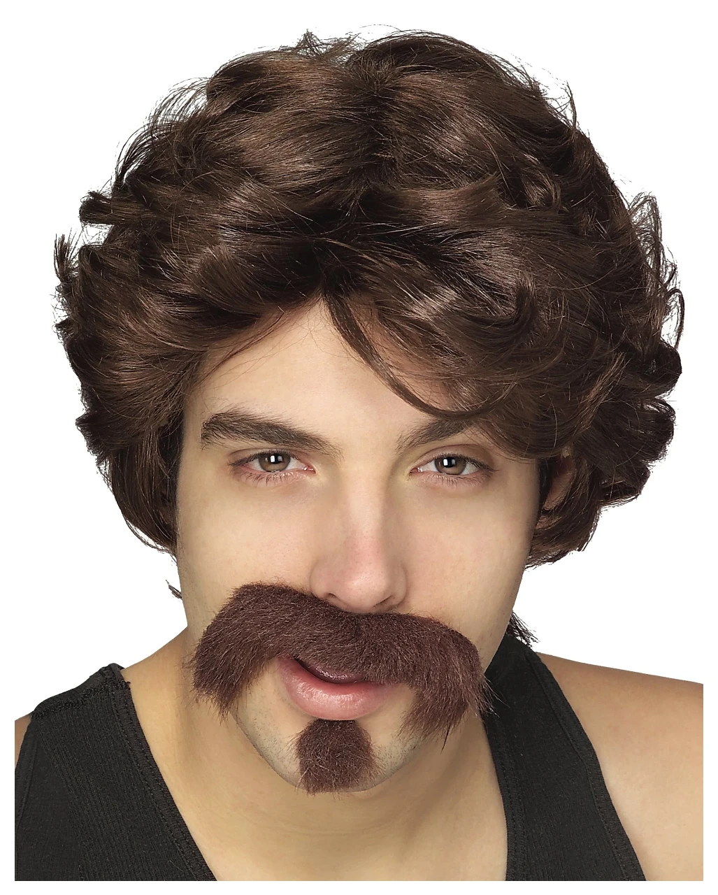 Pornostars der 70er und 80er Jahre trugen ähnliche, aus heutiger Sicht, geschmacklose Frisen. Die braune 80er Jahre Perücke mit ätzender Fönwelle und dem typischen Oberlippenbart, der hier sogar durch ein Kinnbärtchen ergänzt wird, ist der Hit jeder Party und zu Karneval.