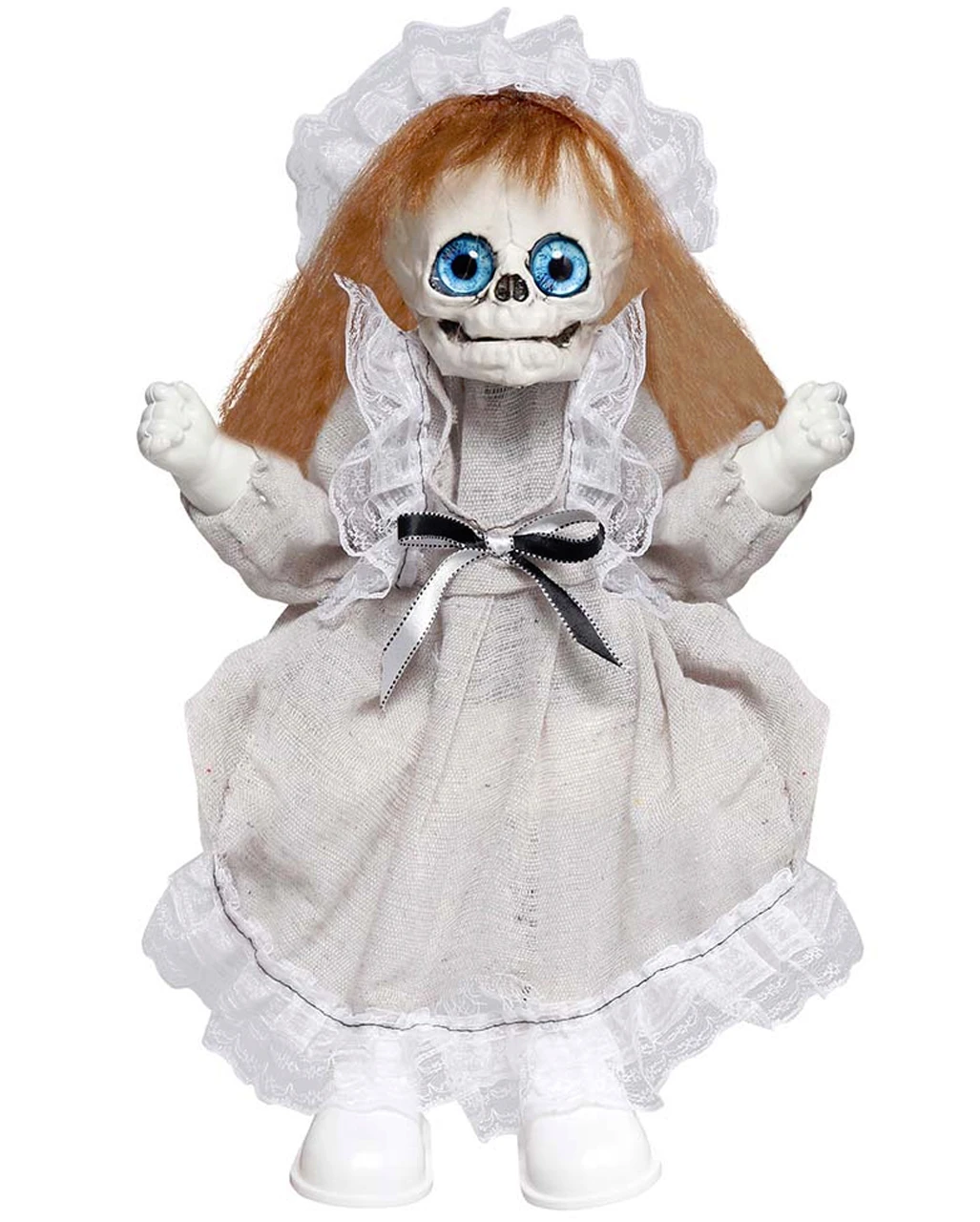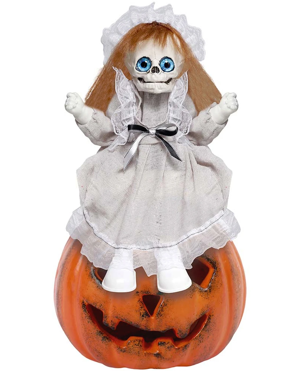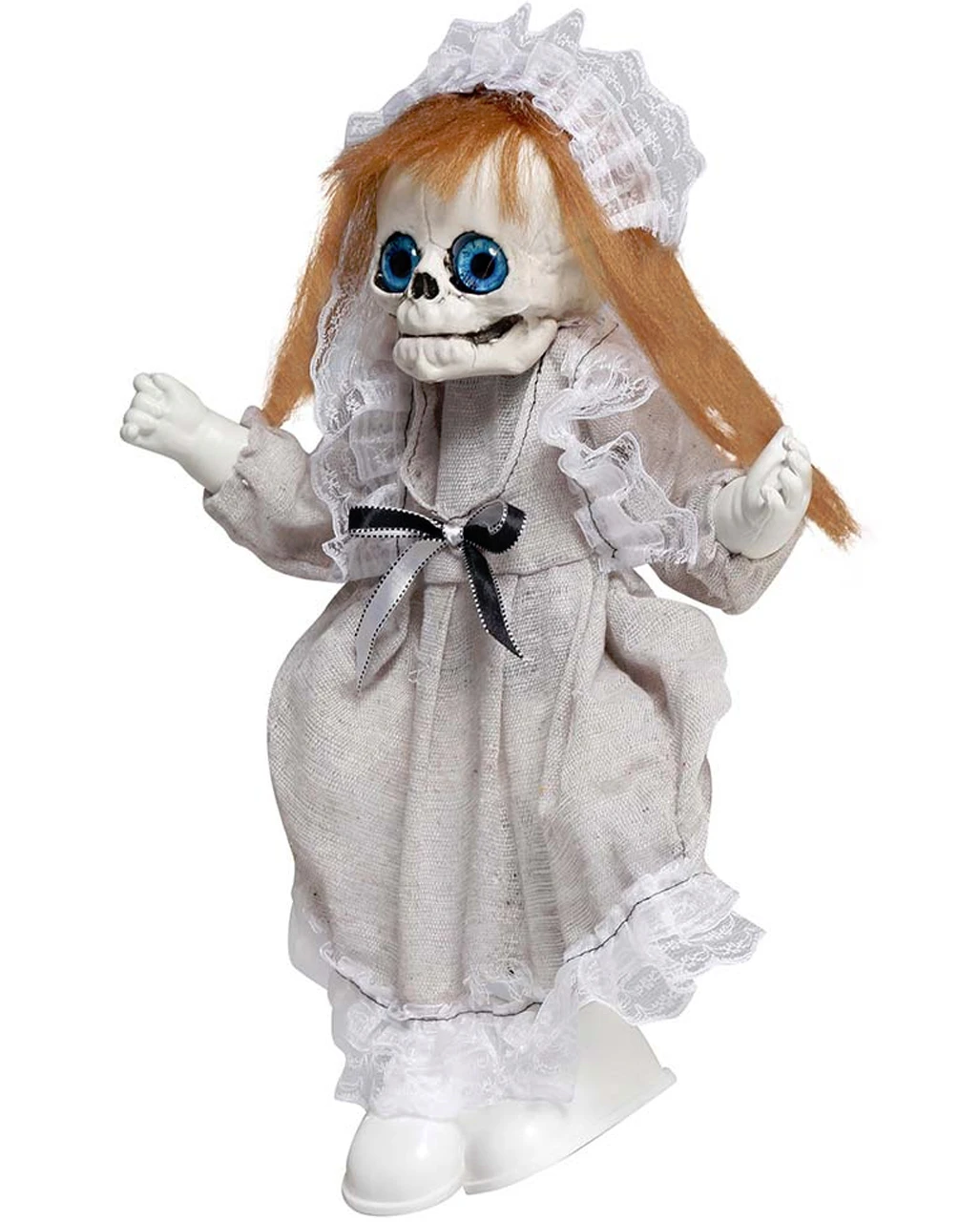 Das Gartenstecker Skelett Püppchen ist eine tolle Halloween Garten Figur, mit der du in Sachen Deko ordentlich punkten kannst. Die gruselige Puppe trägt ein wunderschön altmodisches Kleid mit Rüschen und Schleifen. Schätzungsweise 19. Jahrhundert oder so. Ihre langen roten Haare sehen allerdings schon ein bisschen dünn aus. Ihre blauen Augen dagegen strahlen so zauberhaft aus dem angenagten Skelettgesicht, dass es einen erst recht schaudert, wenn einem auffällt, dass die Gute bloß ein Knochengerippe ist. Weitere Halloween Gartendekoration wie die Halloween Kürbis Gesichter Gartenstecker 4 St. findet ihr hier im Shop.