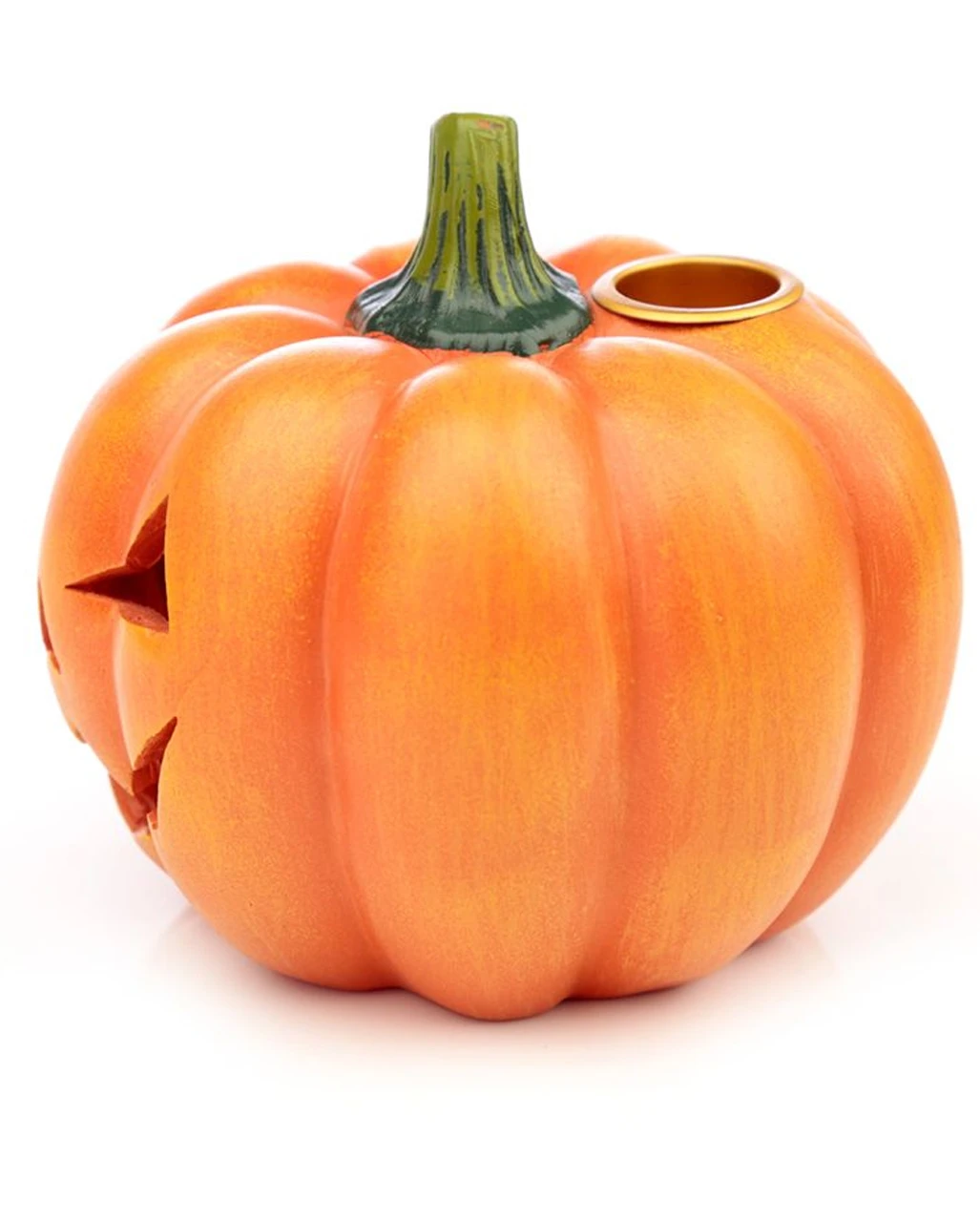 Klassischer Halloween Kürbis Rückfluss Räucherkegelhalter für den Tisch oder den Kaminsims. Bestücke den Halloween Pumpkin aus Kunstharz mit einem Backflow Räucherkegel deiner Wahl und sehe zu, wie dieser langsam aus dem frechen Kürbisgesicht dampft.