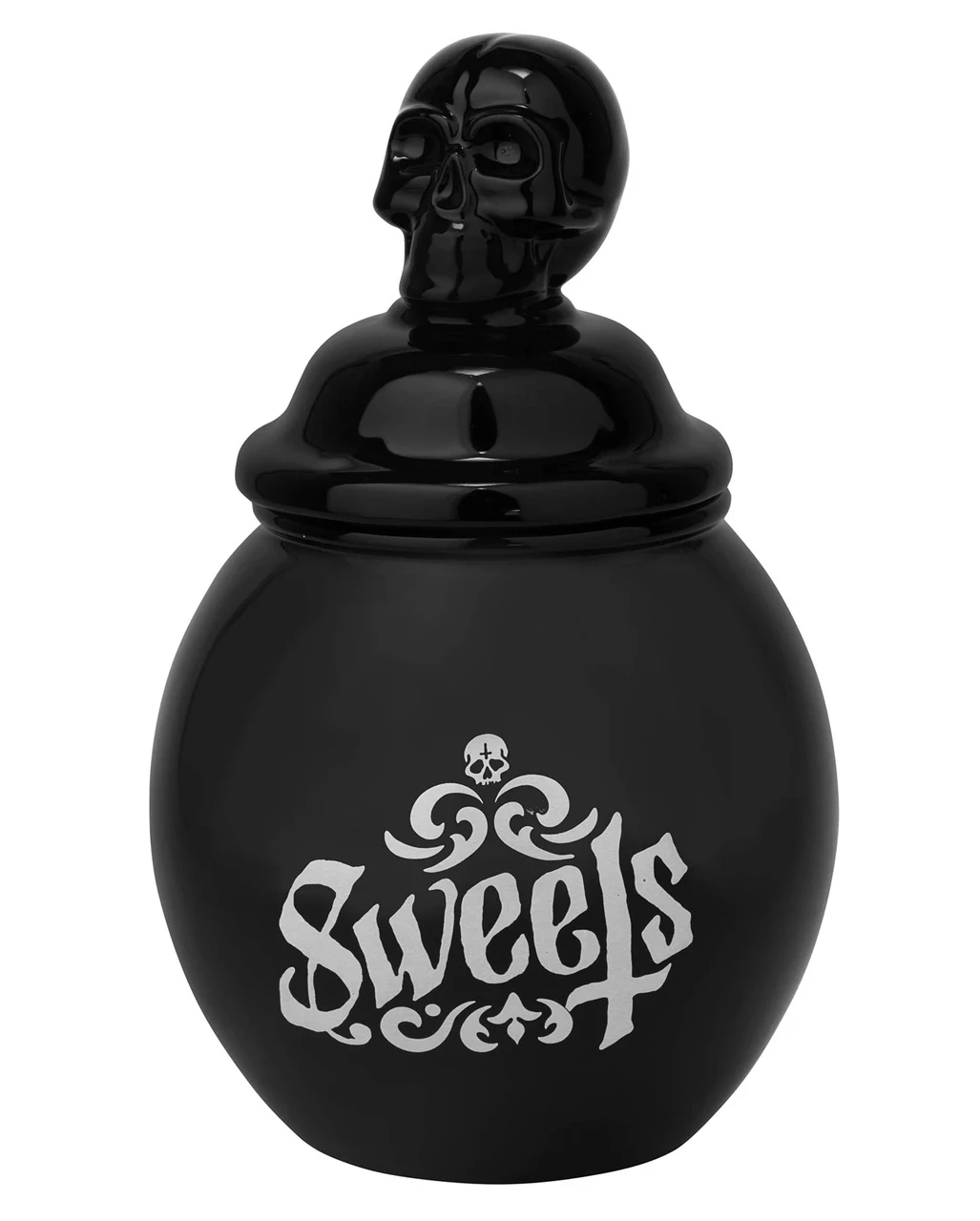 Selbst im magischen Hexenzirkel ist es erlaubt, ab und zu etwas Süßes zu Naschen. Damit deine Lieblings-Candys nicht zu weit entfernt sind, bietet sich unsere KILLSTAR Bonboniere als Gothic Süßigkeiten Behälter aus Keramik an. Die schwarze Totenkopf Bonbonschale mit Deckel macht des Behälter zu einem dekorativen Hingucker.