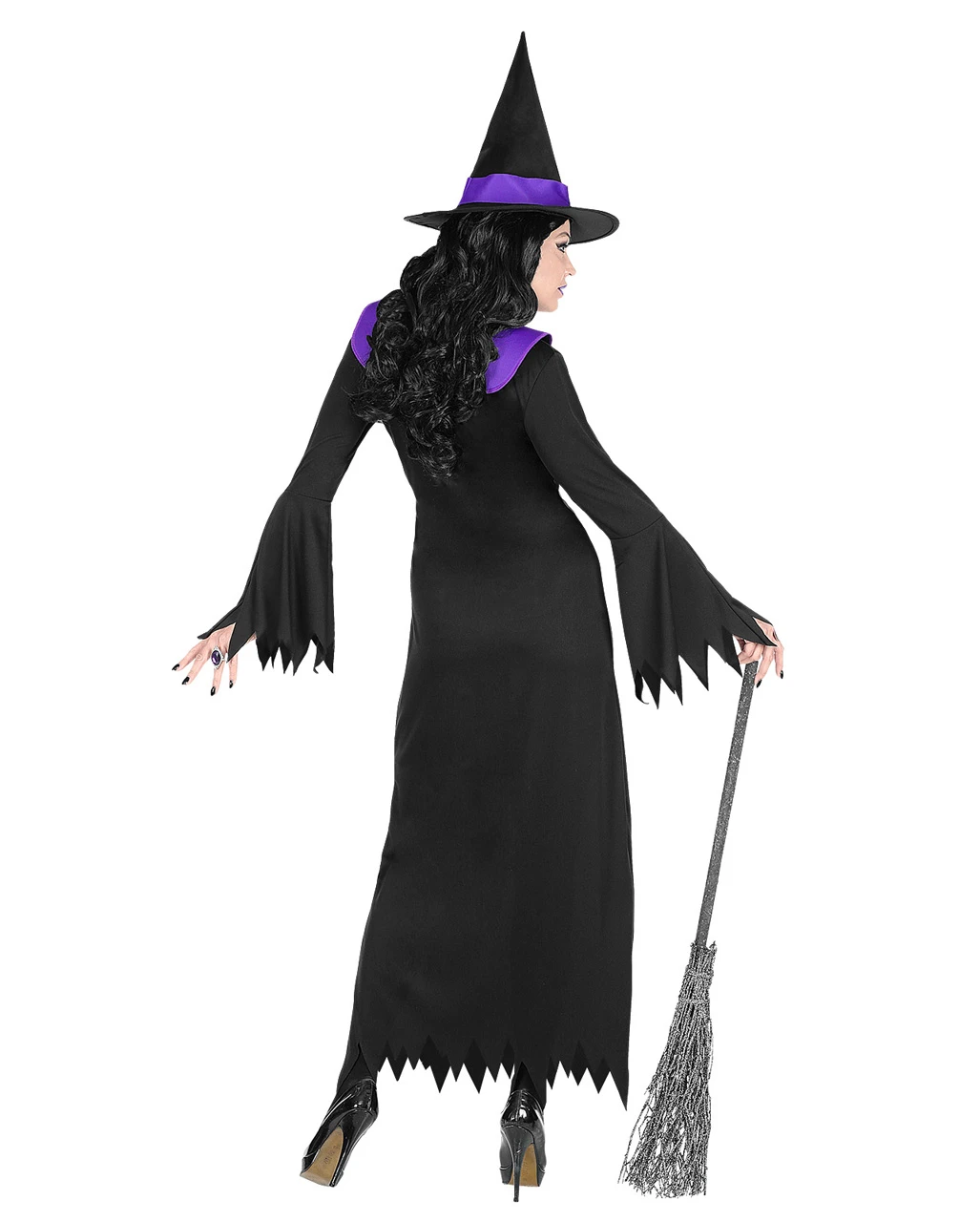 Schwarz-lila Hexen Faschingskostüm mit Spitzhut, Stehkragen und Gürtel