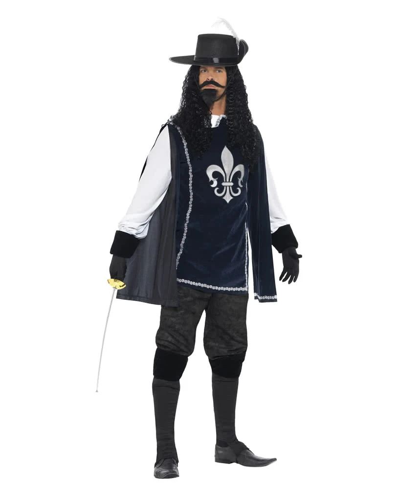 Das Musketier Kostüm plus Hut ist detailliert gestaltet. Angefangen beim Obergewand, welches einen weißen Rüschenkragen besitzt. Aufwendige silberfarbige Verzierungen, die an Vorder-, Rückseite und am Saum entlang verlaufen, werden nur noch durch einen hochwertigen Aufdruck einer Schwertlilie auf der Brust getoppt. Die Ärmel sind weiß und an den Enden schwarz. Ebenso in Schwarz gehalten und aus samtenen Stoff bestehend sind die Handschuhe und Stiefelüberzüge. Für ein perfektes Auftreten bei klassischen Kostümbällen überzeugen ein Oberlippen- und Kinnspitzbart. Passend dazu empfehlen wir den Musketier Gefechtsdegen, um im geschickten Umgang damit ein Fräulein im Sexy Musketier Kostüm Small Medium zu beeindrucken.