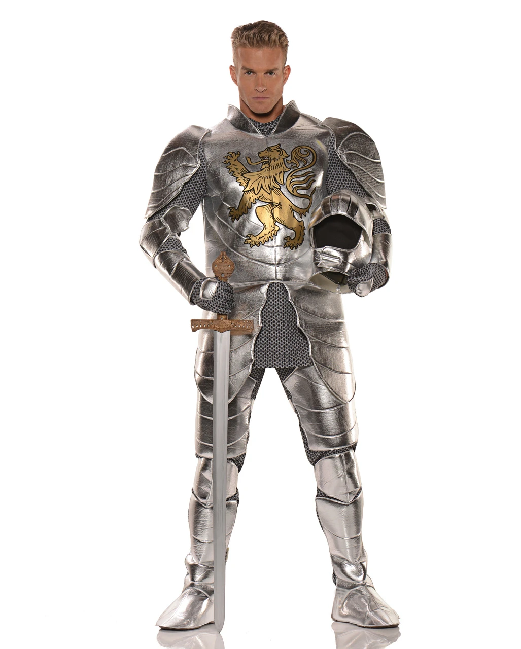 Das Ritterrüstung Männerkostüm besticht durch sein aufwändig gestaltetes Design. Die Tunika mit Schulterpanzer sowie die Kostümhose mit Beinschienen sorgen dafür, dass sofort der Eindruck entsteht, bei der Faschings-Verkleidung handele es sich um eine mittelalterliche Komplettpanzerung. Handschuhe und Armschienen vervollständigen die Ritter-Rüstung und ein klassischer Ritterhelm mit Visier rundet deine Erscheinung als Krieger stimmig ab. Die silber-graue Farbgebung des historischen Kostüms erzeugt einen edlen Look und ein brüllender Löwe in Gold schmückt den Plattenpanzer zusätzlich. Dazu empfehlen wir das Kreuzritter Schwert und die Altertümliche Kriegeraxt.