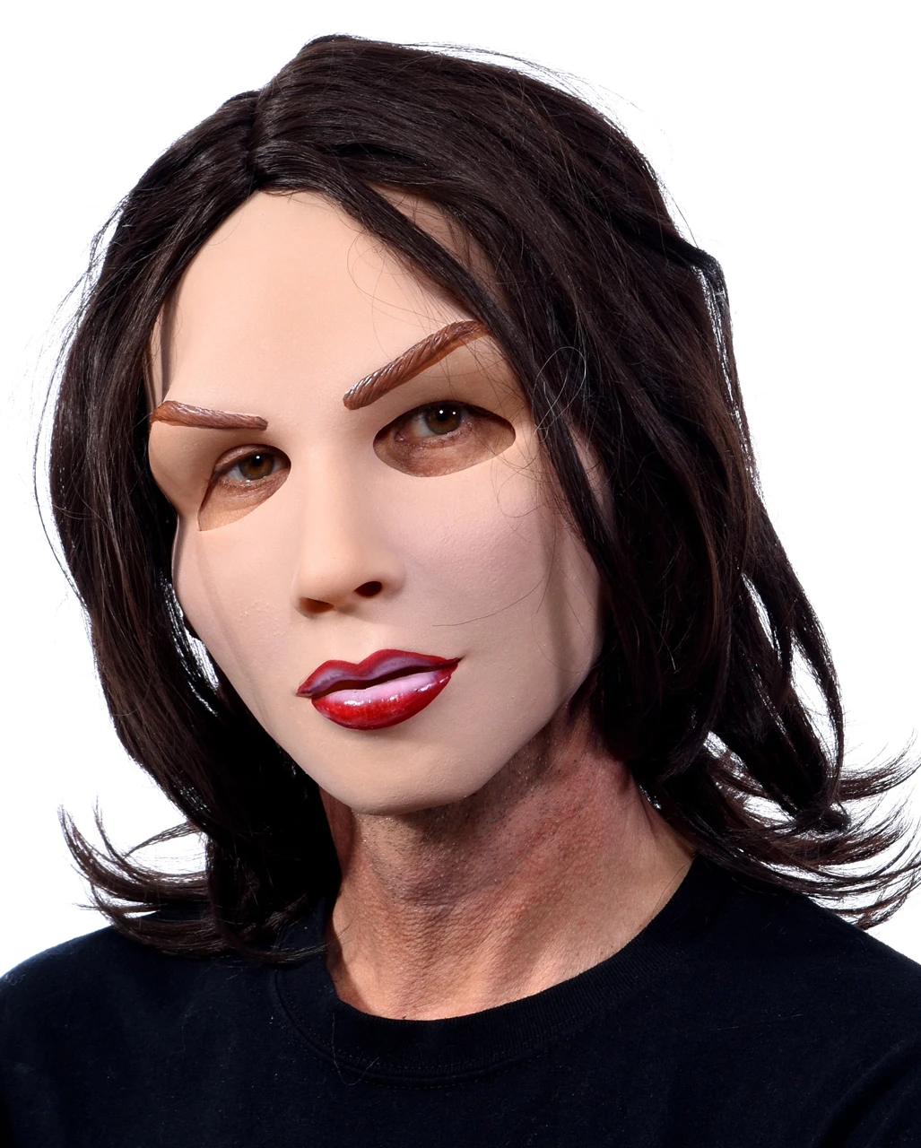 Die sexy Frauenmaske mit Schmollmund ist aus weichem Soft- Latex gefertigt und passt sich ideal der Gesichtsform des Trägers an. Augen, Mund und Nase sind ausgeschnitten, so dass es freies Sichtfeld und genügend Luft zum Atmen gibt. Für die Vollendung der perfekten Schönheit sorgt die dunkelbraune Perücke, deren Haare bis zu den Schultern reichen.