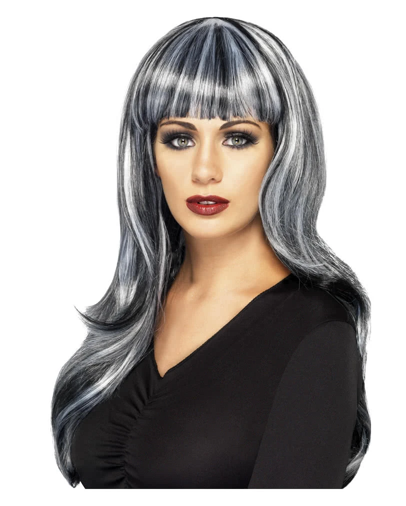 Bestelle dir jetzt deine silbergrau-melierte Halloween Langhaarperücke für deinen Auftritt als Vampiress, Gexe oder Gothic Prinzessin. Mit der bis zur Brust reichenden Sinister Siren Halloween perücke in den schicken Farben Schwarz-Silbergrau besitzt du eine exravagante Kunsthaarperücke für Halloween und Fasching.
