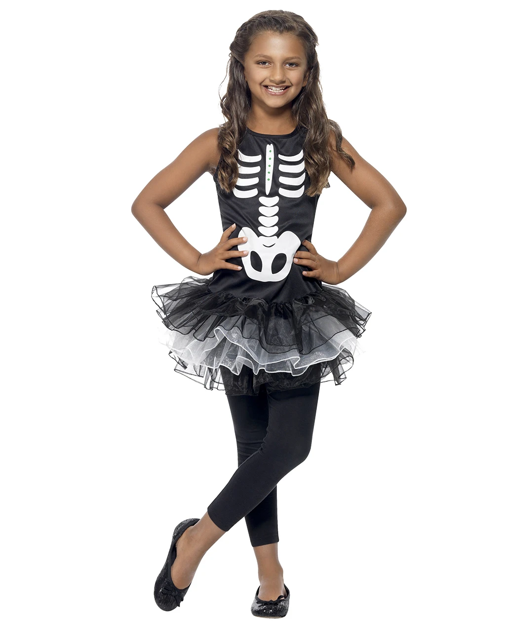Das Skelett Ballerina Kinderkostüm besteht aus einem schwarzen Kleid mit schwarz-weißem Tutu aus mehreren Tüll Schichten. Auf der Vorderseite des Kleides ist ein weißer Skelett Oberkörper aufgedruckt. Kombiniere das Kostüm deines Kindes mit mit dem Family Skelett Make Up Set und der Schwarze Kinder Leggings.
