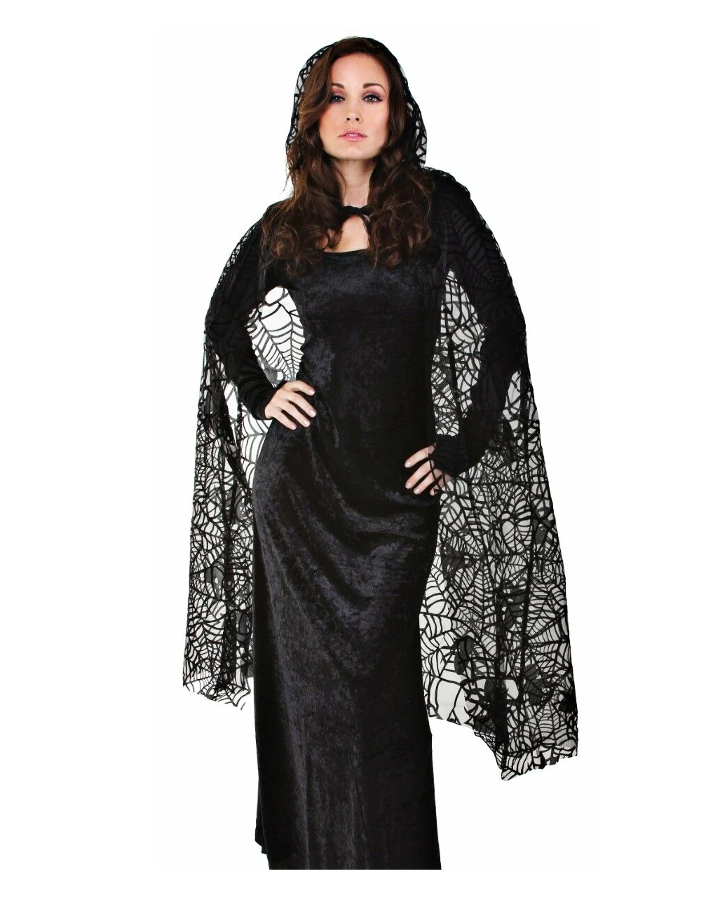 Das Hexen Cape ist aus transparentem Gewebe und hat ein exquisites geflocktes Spinnennetz und Spinnen Muster. Das Spinnennetz Kapuzencape ist relativ eng geschnitten und schmiegt sich von daher an deine Figur an. Einfach das passende Kostüm Accessoire für viele geheimnisvolle Damenkostüme. Das Spinnennetz Kapuzencape ist etwa 140 cm lang, hat eine Kapuze wird mit zwei Bändern geschlossen. Trage zur Hexenverkleidung die Morbide Spinnen Halskette und ein neckisches Haarreif mit Hexenhütchen .