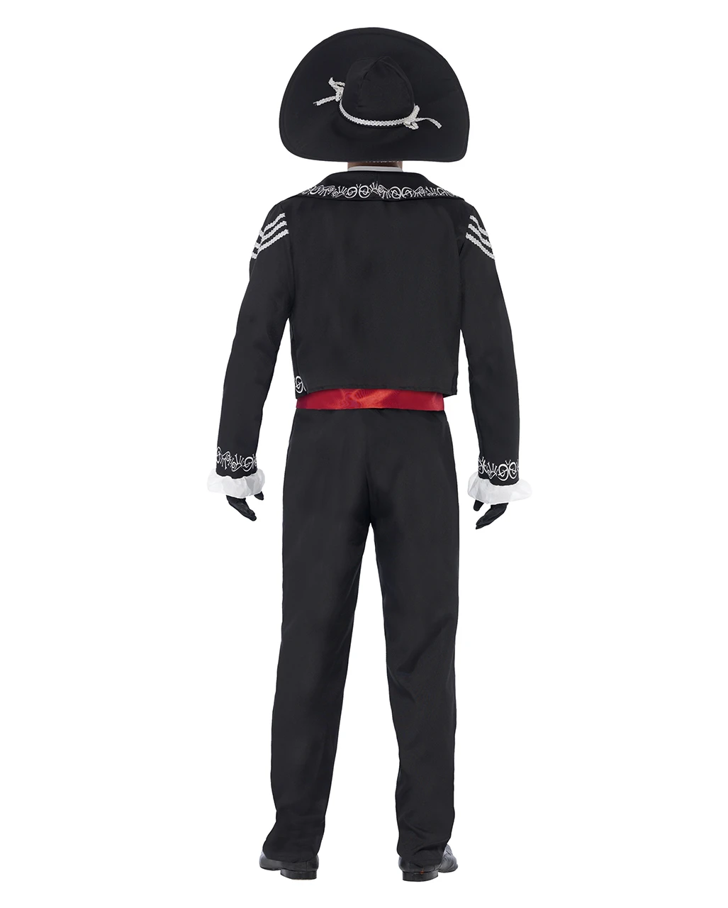 Das Sugar Skull Herren Kostüm XL ist schwarz-weiß mit roten Highlights. Die Skelett Männer Verkleidung wird geliefert mit einem Mexiko-Hut der mit Silberbordüren umrandet und auf der Unterseite mit typischen Skelett-Teilen bedruckt ist auch um den Kopf herum hat er eine silberne Borte & zwei Schleifen. Das Sugar Skull Herren Kostüm beinhaltet noch ein ärmelloses Hemd mit weißem Kragen, das man am Nacken mit einem Klettverschluss schließen kann, mit 3 weißen Knöpfen aus Kunststoff, einer Fliege & ein rotes Satinband, das aussieht wie ein Hüftgürtel, der das Hemd abschließt. Die Hose, das Hemd, die Fliege & die Jacke sind wie der Sombrero mit weißen Knochenteilen bedruckt, die Rückseite ist schwarz. Die langärmelige Jacke des Kostüms hat weiße Rüschen angenäht & auf der Brust klebt eine rote Bräutigam-Rose. Die Schultern der Sugar Skull Jacke sind mit 3 silbernen Bordüren geziert. Mit den Einbrecher Handschuhe Extra Groß und dem Family Skelett Make Up Set ist das Tag der Toten-Kostüm ein Faschings Hit!