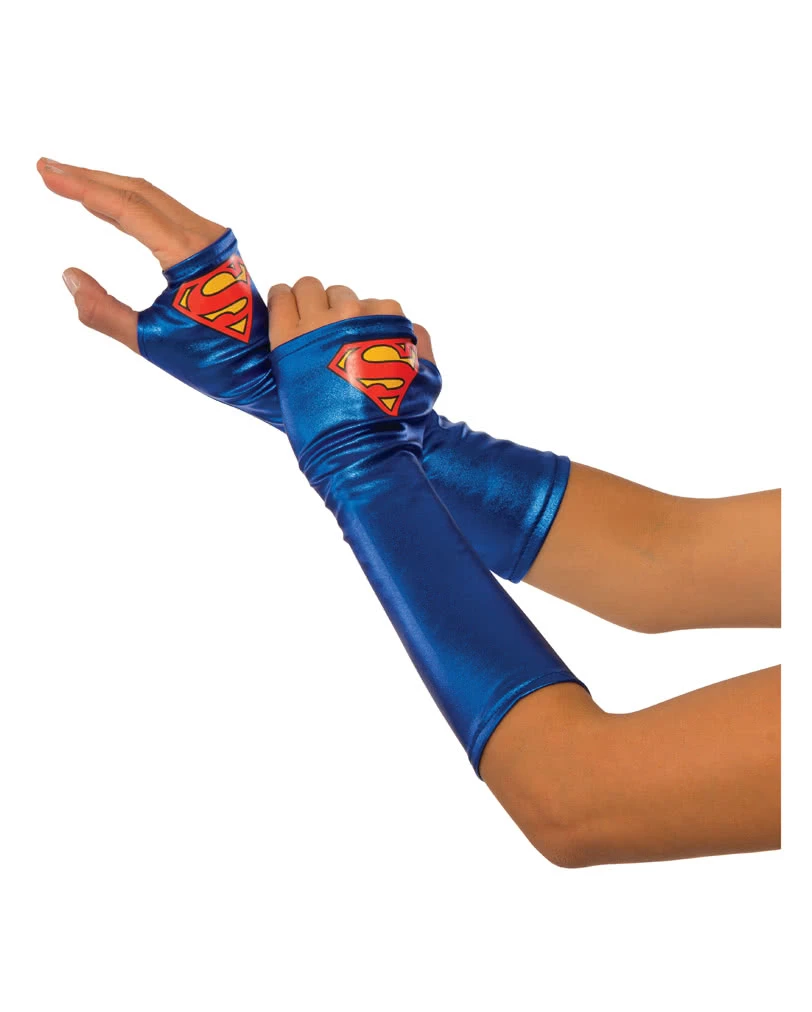 Das Paar Supergirl Stulpen ist aus einem blauen Stoff genäht. Die fingerlosen Handschuhe verfügen über eine kleine Öffnung für den Daumen. Auf den Stulpenhandschuhen ist als Erkennungszeichen das Supergirl-Logo aufgebracht. Die schicke Supergirl Stulpen eignen sich besonders gut als Accessoires für Supergirl Stretch-Minikleid und Sexy Supergirl Corsagen Kostüm. Darin bist du auf Comic Conventions und Faschingspartys ein echter Hingucker.