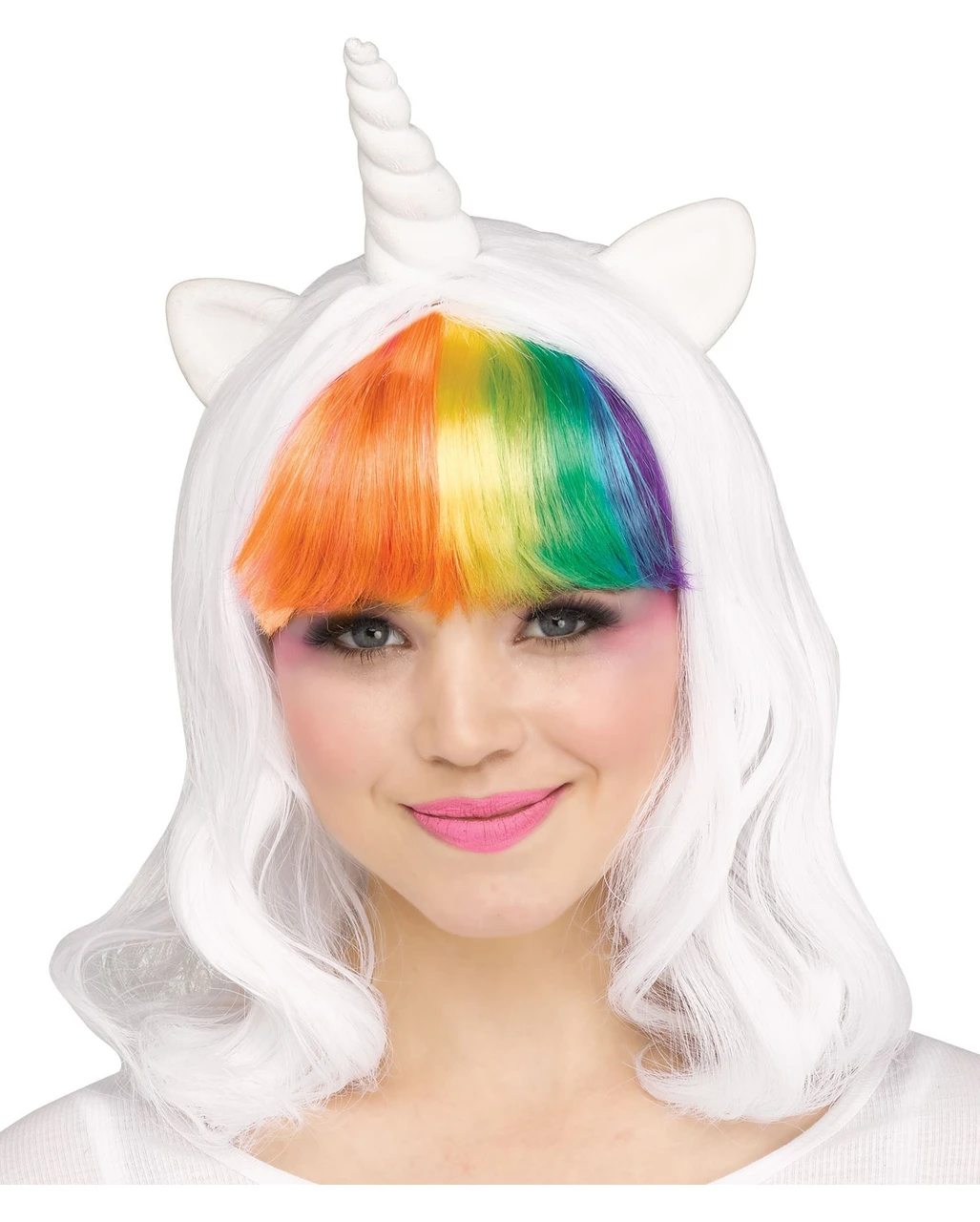 Die Unicorn Regenbogen Perücke ist ein buntes Zubehör für Unicorn-Kostüme. Die Cosplay-Perücke hat einen bunten Regenbogen-Pony, ein Horn und kleine Öhrchen. Der Rest der Haare ist weiß. Hierzu passen unsere Weiße Kniestrümpfe mit Regenbogen und Weißer Tutu-Rock