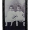 Das Zombie Zwillinge Hologramm Wandbild 48×35 cm im Stil einer alten, schwarz-weißen Fotografie gehalten, zeigt die Halloween-Deko zwei scheinbar süße Zwillinge. Je nach Position des Betrachters wandelt sich das Bild jedoch und präsentiert zwei fies grinsende Zombie-Fratzen. Verschnörkelte Ornamente am Rahmen der Grusel-Dekoration lassen das Wackelbild zusätzlich besonders realistisch wirken.